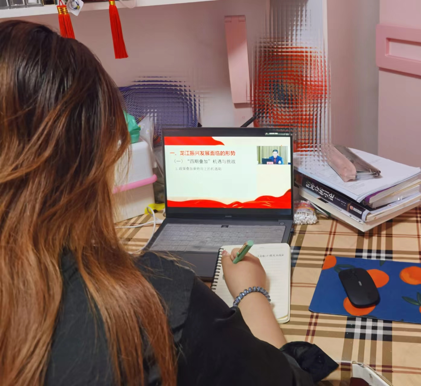 在《龙江振兴发展面临形势与“四个必须”战略判断》培训课中提到龙江正面临着“四期叠加”需赶超跨越的考验与挑战,黑龙江省有着独特的区位条件、丰厚的资源禀赋和优良的生态环境,再加上国家相关政策的支持,作为新时代学生党员要牢牢把握住机遇攻坚克难,发扬历史主动精神,发挥自身专业技能,提高创新创业意识,成为龙江数字经济、冰雪经济发展建设的一份子,在实现龙江全面振兴全方位振兴的时代发展大潮中勇担使命,不负青春。