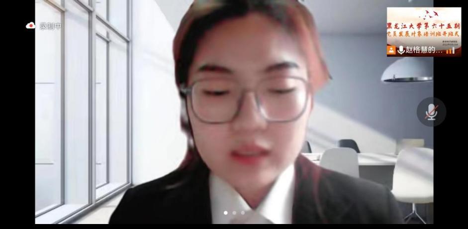随后,培训班学员代表2019级赵格慧同学进行发言。她表示通过本次培训能够深入、系统地学习党的知识,提高思想水平和政治素质,会积极向党组织靠拢,尽快成长为一名合格的共产党员。她代表全体学员作出承诺:第一,在培训过程中,努力学习,积极参与小组讨论;第二,端正学习态度,严格遵守党课纪律,高质量完成培训各个环节;第三,在培训结束后,努力将理论学习与实践相结合,为身边同学起到模范带头作用。