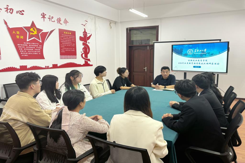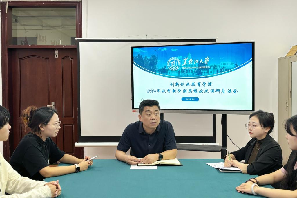 于9月6日19时在汇文楼959室召开新学期思想状况调研座谈会。本次会议由院党委副书记屈广宁主持,2023级辅导员宋美琪、2024级辅导员梁曼及各年级学生代表参加会议。