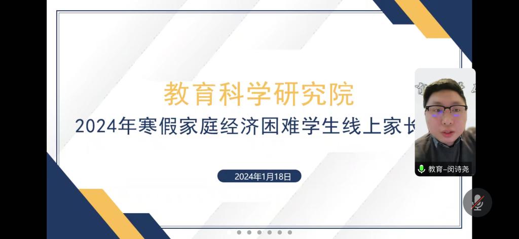 为推进家庭经济困难学生认定和资助工作的精准化,更实、更细、更规范、更到位地做好家庭经济困难学生资助工作,确保各项资助政策落实到位,进一步宣传党和国家的助学政策,帮助每一位家庭经济困难学生及其家长更好地了解相关的资助政策,落实立德树人根本任务,传递学校暖心关怀,形成家校育人合力,同时全面了解和掌握学生寒假期间的学习及生活情况,增强家校联动工作机制进一步落实做细,教育科学研究院于2024年1月召开家庭经济困难学生家长会、进行“云”家访等工作。