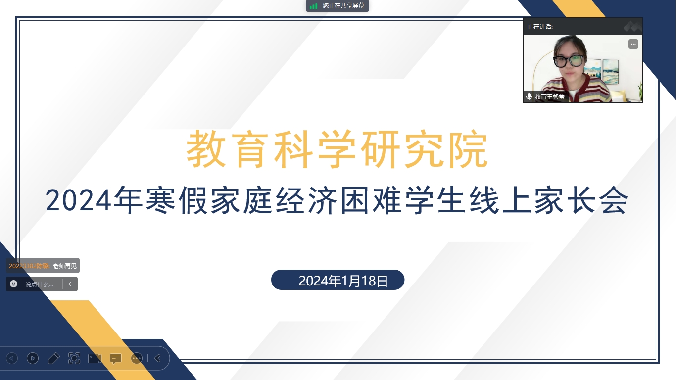 教育科学研究院于2024年1月18日18时30分在腾讯会议平台开展家庭经济困难学生家长会,2021级辅导员王馨莹主持会议,院党总支副书记屈广宁、各年级辅导员、家庭经济困难学生及其家长参会。会议伊始,2022级辅导员闵诗尧对家庭经济困难学生及家长表达了亲切的关怀和问候,向学生及家长宣传了国家及学校的资助政策,介绍了包括奖学金和助学金在内的我校本科学生资助工作体系及学生资助政策的相关情况,详细介绍了学校学院在学生日常事务管理服务、家庭经济困难学生教育帮扶等方面工作开展情况,讲解了家庭经济困难学生认定与动态管理的工作原则。随后,学院的党总支副书记屈广宁与家长进行了面对面的沟通交流,表达了对学生的嘱托和期盼,希望家庭经济困难学生注重自身学业,自立自强,不断提高个人知识水平和能力。同时表明学校和学院对家庭经济困难学生的关切与照顾,强调家庭经济困难学生要加强自身自觉性,避免生活中的过度消费。最后提醒低年级的学生应把握住时间充实自己,多学习,做好长远规划,高年级学生找准方向,明确目标,脚踏实地地努力前进。