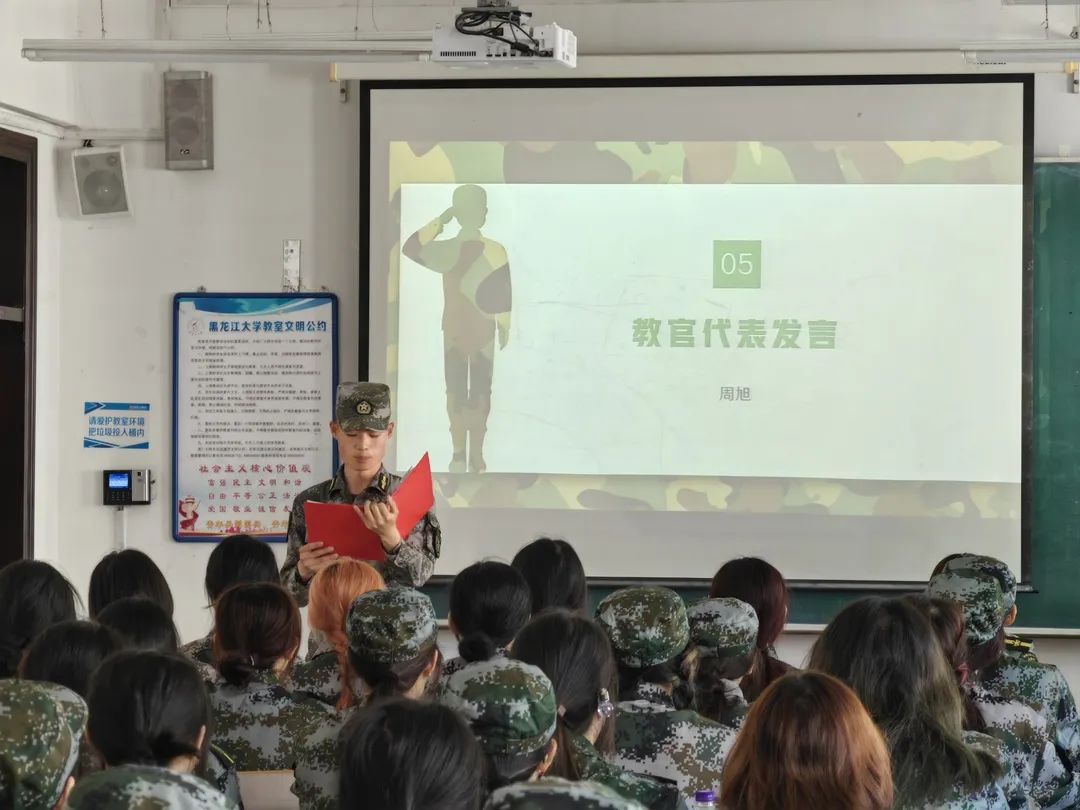 随后,军训教官代表周旭进行发言,为让同学们能更好地完成本次军训任务,他对所有参训同学提出几点要求和注意事项,并提醒大家在军训期间注意补充水分和营养,注意预防传染性疾病等。希望大家都能够在军训过程中提高自己的政治觉悟,激发爱国热情,培养艰苦奋斗,刻苦耐劳的坚强毅力和集体主义精神,增强国防观念和组织纪律性,养成良好的学风和生活作风,掌握基本军事知识和技能。