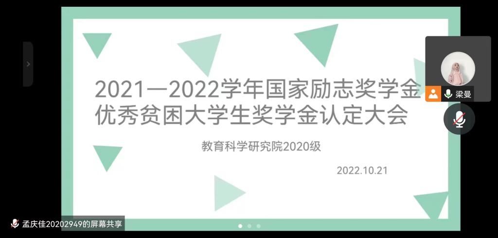 为切实做好学院资助育人工作,保障学生得到有效的资助,根据学生工作部《关于评定2021-2022学年国家励志奖学金的通知》与《关于评定2021-2022学年优秀贫困大学生奖学金的通知》相关要求,教育科学研究院高度重视,成立以院党总支副书记为组长的认定工作领导小组,各年级于2022年10月21日组织召开国家励志奖学金、优秀贫困大学生奖学金评定会议,由2019-2021级辅导员主持,家庭经济困难学生参加会议。