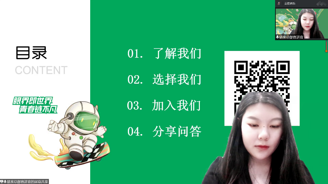 会议伊始,链家宣讲老师强调了选对行业的重要性,行业本身的发展趋势影响着自身是否逆风发展。随后讲解了链家的基本情况、发展历史以及行业状况,并为同学们普及了当前流行的两个行业主流,分别是房地产行业和电商行业,指出了链家工作的优势。之后向同学们介绍了链家的服务方式以及职业工作内容,房产经纪人职业定位的多样性,是四大职业角色的综合体。