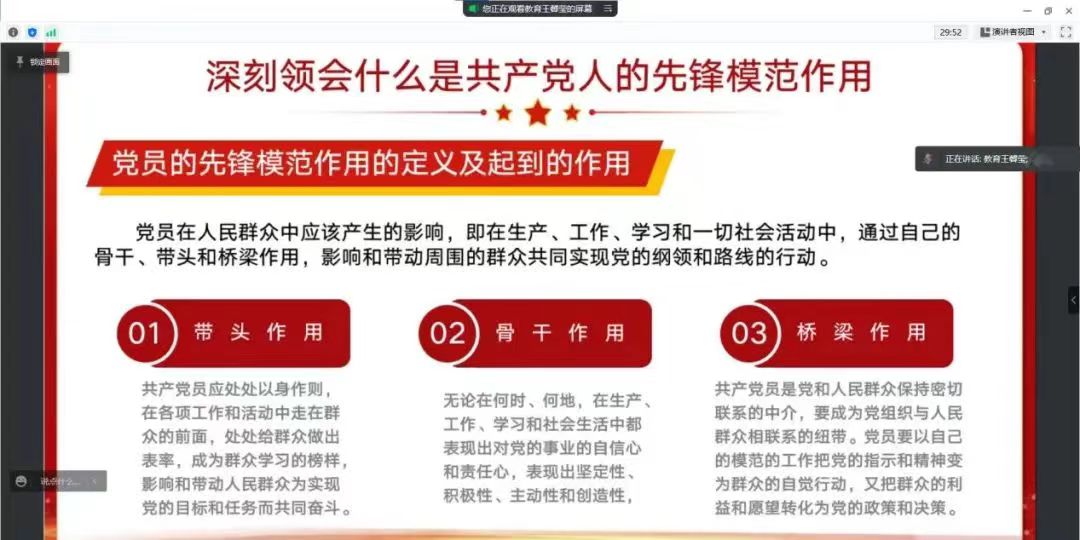 接着,王老师进行理论知识授课,将本次理论部分授课内容分为“深刻领会什么是共产党人的先锋模范作用”、“战疫对党员先锋模范作用要求”、“战疫如何发挥党员先锋模范作用”三个方面。她指出,作为一名学生党员要在全体学生面前发挥好带头作用、桥梁作用、骨干作用,处处以身作则,发挥优势,积极向身边同学做好引导,在疫情防控中找准位置以自己的模范行为带动并影响身边的人。同时要讲政治、讲担当、讲奉献、讲纪律,时刻以一名党员身份去严格要求自己,提高政治站位,争当疫情防控的急先锋、排头兵,充分发挥学生党员在疫情防控中的先锋模范作用。