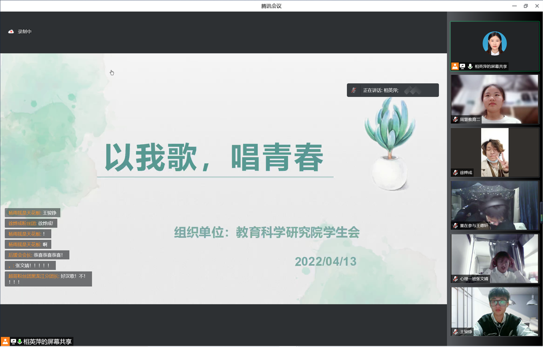 时光静寂流逝,永不复返,但这阻挡不了我们在热爱的日子里闪闪发光。以我心中的歌,唱我的青春!至此,教育科学研究院“以我歌,唱青春”线上歌唱比赛在师生们的赞美与不舍中落下帷幕。师生们纷纷表示,期待学院下一场精彩活动的到来!(教育科学研究院供稿)