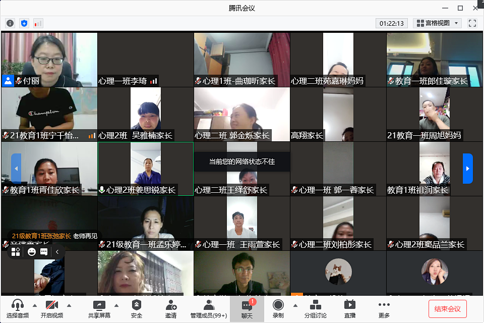 为使2021级新生及家长更加全面地了解学校和学院的整体概况、专业特色、人才培养等工作,进一步加强家校联动,促进家校互联互通,2021年9月3日18时,教育科学研究院于腾讯会议平台召开线上2021级新生家长会,家长会由学院党总支副书记付丽主持,学院党总支书记金鹏、院长王世红、副院长佟玉英、2021级辅导员王馨莹及2021级全体学生家长出席家长会。