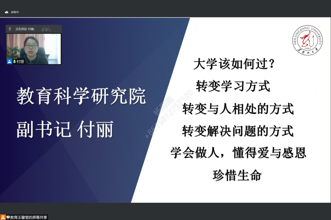 会议第三项,付丽副书记对2021级全体新同学的到来表示热烈的欢迎和真挚的祝贺。她表示,同学们在建党100周年和建校80周年之际,迈入黑大校门,开启学业新征程的同时,要尽快完成从高中生到大学生的“三种转变”:一、要转变学习方式,适应大学的教学方式,学会自觉和自律;二、要转变与人相处的方式,努力建立全新的朋友圈,学会包容和理解;三、要转变解决问题的方式,不依赖家长,学会自立和坚强。此外,付书记还提出“五个要”:一要注重综合素质的提升,积极参加学校学院组织的各类活动;二要积极践行社会主义核心价值观,肩扛时代赋予之责任与使命,积极向党组织靠拢;三要关注自我身心健康,及时排解自身压力;四要遵守校规校纪,规范自身行为;五要明辨是非,具有正义感、充满正能量,懂得爱和感恩,善于发现生活中一切美好的事物。