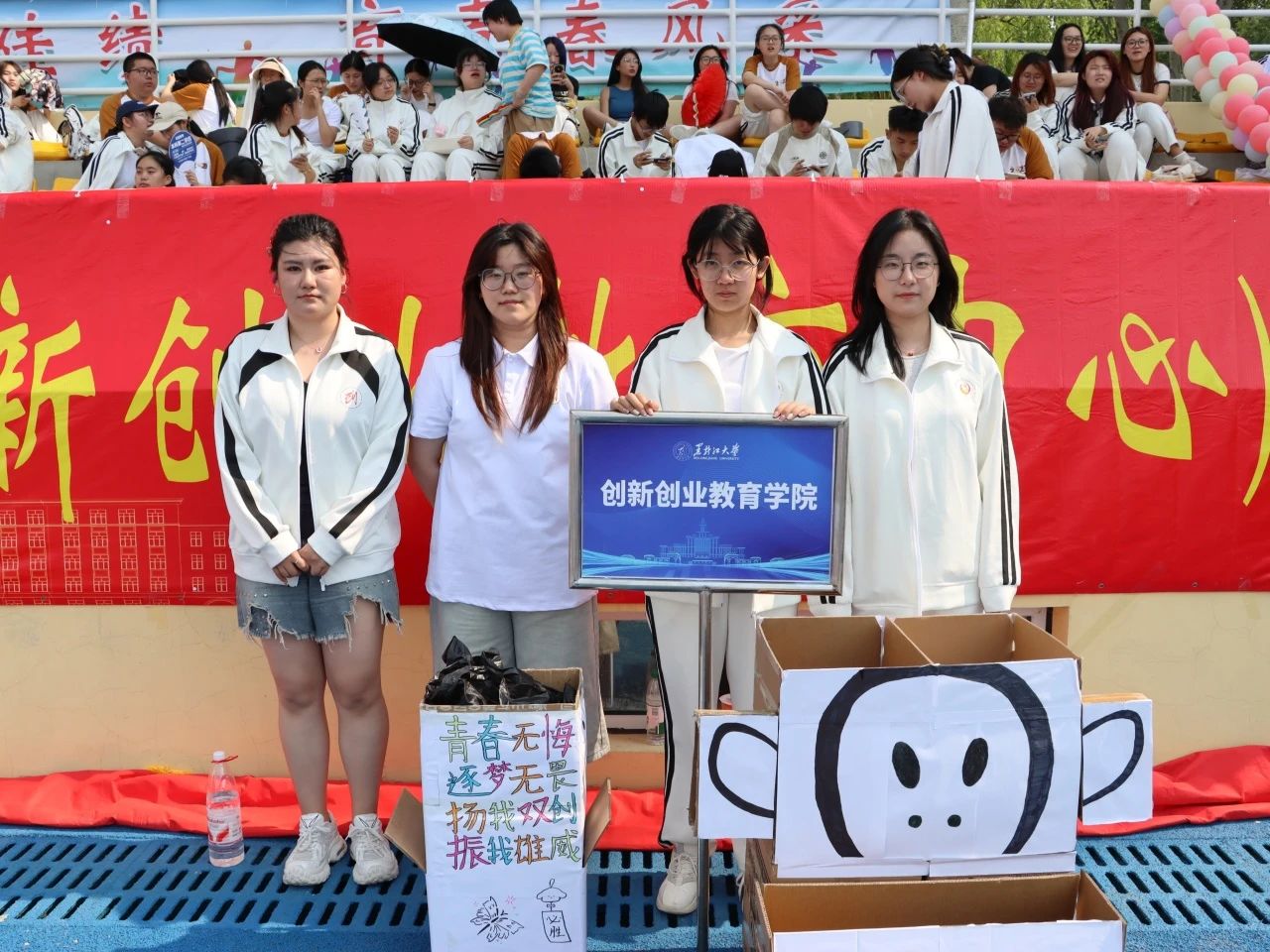 青年志愿者协会开启创意之旅,将学院标识与环保理念深度融合,精心构思出专属垃圾桶方案。活动中,志愿者们积极践行环保理念,收集废弃纸箱拆解重塑,构建出垃圾桶框架;随后充分发挥艺术才能,从图案设计到色彩搭配,以匠心巧思为运动会注入一抹亮眼的环保色彩。